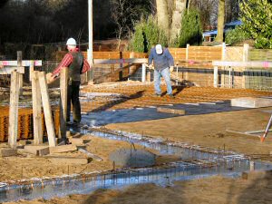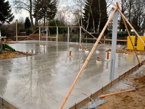 13.01.2005 Die Platte ist gegossen, die ersten Ständer sind ebenfalls schon einbetoniert. Wow!